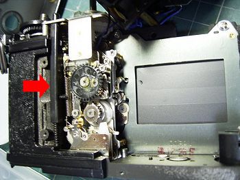 ![]() | 写真は前述のユニット除いたボディーです。奥にはシャッター幕、右下の黒い円柱は電池ボックスです。赤矢印はレリーズシャフトですが、驚いたことに、プラスチック製でした。シャッター部のギアは、金属製とプラスチック製が混在しています。 |