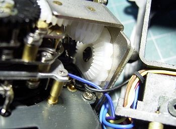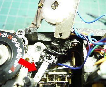 ![]() | この連動部ギアを外して、上部からの覗いた写真です。赤矢印の金属が露出計スイッチになっています。レリーズを半押しにすると露出計が動く仕組みです。 このスイッチの上部に、黒い革の塊見えます。最初は黒いごみか、外皮の一部でも引っかかっているのかと思いましたが、これは絶縁の目的でかぶせてある合成皮革でした。取り去ってはいけません。 |