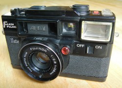 発売年:1978年レンズ:FUJINON 38mm/F2.8 サイズ:131×76×54mm シャッター速度:1/8〜1/500秒 重量:約340g 電池:単3乾電池 2個 当時価格:44800円