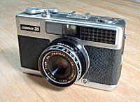 発売年:1967年レンズ:FUJINON 38mm/F2.8 サイズ:120×73×57mm シャッター速度:B・1/30〜1/250秒 重量:約440g 電池:セレン光電池 当時価格:14900円 セレン光電池によるプログラムEEおよびマニュアル操作可能のカメラ。コンパクト35シリーズの初代機種。距離計はなく目測式。ファインダー内にゾーンフォーカスピクトグラム距離指針表示がある。A位置でプログラムEE。A以外では、絞り、シャッター速度ともに任意に設定できる。オート時のみファインダー内に絞り値とシャッター速度が指針表示される。セイコーLシャッターを搭載、レンズは4群5枚。フィルムカウンタは底部にある。 |