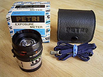![]() | 貴重なペトリの単体露出計です。元箱、純正ケース、ストラップ付きの状態で手に入れました。 当時の価格は、本体が1800円、ケースが400円という表示があります。 |