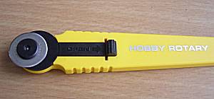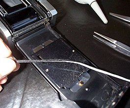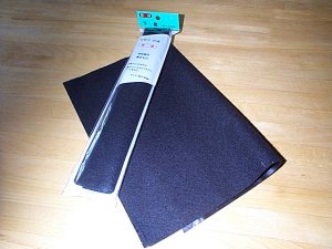 そこで登場するのが、「書道用下敷き」です。小学校の時に使った、あの思い出の「黒い布製の下敷き」を使います。最近では、裏面に滑り止め加工をしてあるものもあり、これがモルトプレーン代用品としては最適です。(写真のものは100円ショップで購入した下敷き)なぜなら、この加工面は「両面テープ」を貼るのに極めて適しているからです。両面テープを貼ったら、貼りたい幅や長さに合わせて切り取りさえすれば、後はカメラにピンセットなどで貼り付けるだけです。なお、切り取る時は、カッターナイフでもいいのですが、写真のようなローラーカッターを使うときれいに切れるようです。