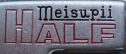 東郷堂メイスピー35ハーフ。軍艦部には「MEISUPII HALF」とあるが正式名称は「MEISUPII 35 HALF」露出計、距離計はない。レンズはサンコール40mmの固定焦点、F6.3とF8バージョンがある。シャッター速度はボディー全面のダイヤル(B・1/25・1/50・1/100秒)で切り替えられる。シャッターチャージレバーは鏡胴下側にある。絞り(5枚の絞り羽根)は鏡胴にあるリングで(F6.3/8/11/16/22)調整できる。フィルムカウンタは残数表示。軍艦部にシンクロ接点がある。フィルム圧板は非平面。製造元は東郷堂、国内代理店は明興社。