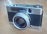 発売年:1964年レンズ:ROKKOR-PF 32mm/F1.8 サイズ:108×68×50mm シャッター速度:B・1/8〜1/500秒 重量:約440g 電池:セレン光電池 当時価格:13800円 マニュアル操作のハーフサイズカメラ。セレン光電池による露出計が付いている。シャッター速度を決め、絞りは露出計指針に合わせる追針式。フィルム感度はASA25から800まで対応している。距離計はなく目測式。ハーフサイズながら、前群レンズ回転式ではなく、直進ヘリコイド方式。フィルム巻上げはノブ式ではなく、レバー式をを採用している。 |