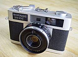 プログラムEEの距離計連動式カメラ。資料によると「ミラージュ」ではなく「ミラージ」と発音する。KONICA C35外観、構造ともに酷似している。OEMの可能性もある。ファインダー内には、絞りとシャッター速度が指針表示される。鏡胴リングをAの位置でプログラムオート、Bの位置でバルブ、GNはストロボ撮影用となる。CHINON 35EEと同機種、異名と思われる。資料によるとレンズはCHINONEX COLOR 38mm/F2.7(3群4枚)であるが、プレートには38mm 1:2.7とあるだけで、レンズ名の記載はない。ボディーにもCHINONの文字は見当たらない。