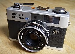 発売年:1974年レンズ:RIKENON 40mm/F2.8 サイズ:111×71×57mm シャッター速度:1/4〜1/800秒 重量:約380g 電池:HM-N(NR52)型水銀電池 2個 当時価格:27000円 プログラムEEの距離計連動式カメラ。 プログラムシャッターのため、電池がないとシャッターは 切れない。二重像合致式距離計でピントを合わせれば、 後はシャッターを切るだけ。試写してみると実にしっか りとした写りをするので驚かされる。 |