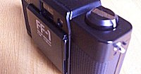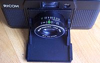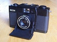 距離目測式、プログラムEEカメラ。レンズは沈胴式で前蓋を閉じると、カメラの厚さが35mmと極めてコンパクトなカメラ。FFはフルフラットの意味。小さなピントリングで距離を合わせる。ストロボ使用時には絞りリングで絞りを設定できる。露出警告はLED発光方式。当時、ミノックスELと類似性を指摘されたが、開発設計はリコー独自のもの。プラスチックボディーながら丈夫な設計で質感の良いカメラ。 |
