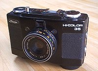 ![]() | 発売年:1971年レンズ:COLOR RIKENON 35mm/F2.8 サイズ:110×74×52mm シャッター速度:1/30〜1/300秒 重量:約440g 電池:H-C(MR44)型水銀電池 1個 当時価格:17800円 シャッター速度優先EEおよびマニュアル操作可能な距離目測式カメラ。距離計はなく目測式だが、ファインダー内に距離目盛りが見えるので使いやすい。絞りはレンズまわりのリングで設定する。AUTO位置ではシャッター速度優先EEになる。露出不足の時はファインダー内に赤色マークが表示される。シャッター速度は、レンズのまわりのプラスチック板に表示される。 フィルム巻き上げは、底部にあるゼンマイによる自動巻き上げ式。フィルムを入れないと、シャッターはチャージされない。軍艦部にはフィルム感度設定リング(ASA25〜400)と電池ボックスがある。 HI-COLOR35と違い、上部から見たときに形状が台形をしている。色も黒色の「塗り」で質感がよい。当時のキャッチコピーは「ブラッキー」。 |