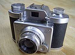 発売年:1955年レンズ:C.EZUMAR ANASTIGMAT 50mm/F3.5 サイズ:105×70×67 シャッター速度:B・1/25・1/50・1/100秒 重量:約440g 電池:なし 当時価格:6800円 フルマニュアルカメラ。Aの文字が3つ並んだロゴの三栄産業株式会社製。距離計はなく、直進ヘリコイド式の目測。シャッターはバルブを含めて4速、前面のダイヤルで設定する。フィルムを巻き上げ、写真右のボタンでシャッターをチャージさせる。その際、このボタンに接しているカムが押し込まれ、フィルムカウンタを1枚進めるという仕組み。写真左のボタンがシャッターレリーズボタン。裏蓋は脱着式で、フィルムスプールが1個付属する。 |