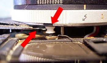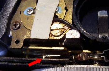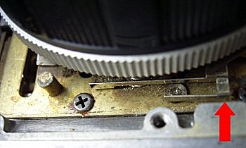 ![]() 続いて、このカメラは、絞りリングをA(オート)位置にした時に 露出計が動作するようにできています。図の金属板がその スイッチになっています。 |