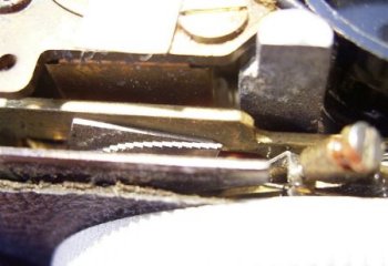 ![]() 露出不足や露出計の故障で指針が振れない時、このように 指針とノコ歯が噛み合わず、シャッターは切れないことになります。 露出計の原理はこちらをご参照ください。 |