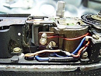 不動の露出計です。断線はないようです。 細部まで調べたところ、残念ながらコイル の内部断線で再起不能です。今回は、マ ニュアル機として使用することにしました。