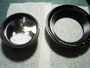 続いて、レンズかびのクリーニングです。 前面の銘板を回転させるとこの状態になります。 後は、カニ目リングを外すとレンズを分解するこ とができます。オキシドールでかびの除去です。