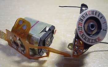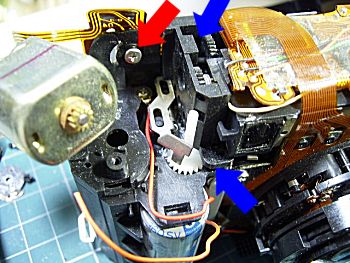簡単に外せると思ったのですが、難関が待っていま した。レリーズボタンユニットはすぐに外れましたが、 赤矢印スイッチのネジが内側から締めてあります。 つまり青矢印ねじをゆるめてモーターを外す必要が あるのです。周辺のリード線も外しておきます。