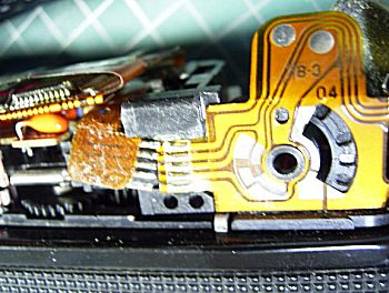 スイッチ部分です。フレキに注意深く半田ごてを 当てて、外します。取り付けは、この逆の手順で 行います。幸い、移植後正常に動き出しました。