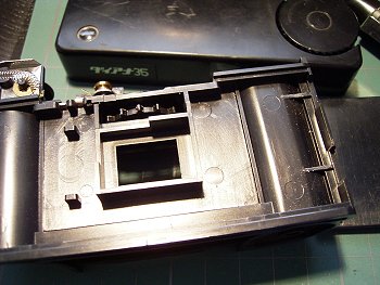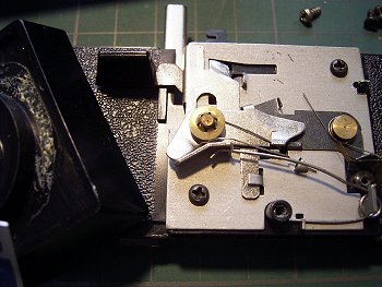 フィルム巻き上げでスプロケットが回転し、これだけの部品で、シャッター チャージから、フィルムカウンタまでを動かしています。 ダイアナ35というカメラも謎だらけですが、付属する外付けフラッシュガン にも謎があります。電源を確認しようとフラッシュガンを分解(接着されている) すると、古い単3乾電池が2本入っていました。電圧は1.5Vの直列で3Vです。 当時3Vの電圧で発光するフラッシュバルブがあったのでしょうか? *フラッシュバルブについて、ある方から情報をいただきました、 AG-3Bの発光電圧3〜25Vだそうです。私の手元にもありました。 どうもありがとうございました。