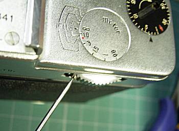 ピント調整ノブ(ローレット)をどう扱うかが レストアのポイントです。SEやEEには半月状に 切り欠があるのですが、MやMLにはなく、円形 をしています。芋ネジを緩め、軍艦部カバー と共にローレットも一緒に持ち上げます。