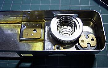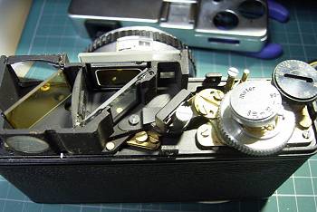 軍艦部を元に戻すときのコツです。 軍艦部に、フィルムカウンターと、距離円盤をセットし ておきます。表面からセロハンテープで止めておくの もいいでしょう。この状態でボディーに組み込みます。