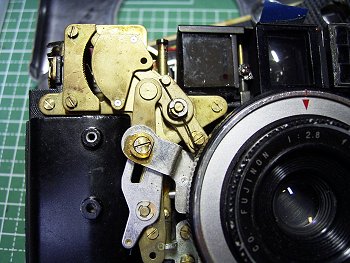 モナカ構造のカメラですので、貼り皮をすべ て剥がしてからボディーカバーを取り外しま す。写真は、露出計からシャッターへの連動 部です。動きに問題はなさそうです。ベンジ ンで軽くクリーニングをする程度にしました。