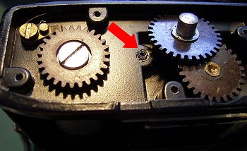 ![]() 底部です。巻き戻し用ボタンは、スプリング で支えられたギアを押し込むというシンプルな構造です。 全体として故障の出にくい構造をしているといえます。 |