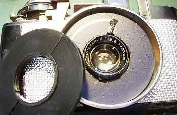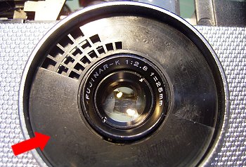![]() 鏡胴には距離調整のように見えるつまみがありますが、 これを回転させることで距離はなく、絞りの調整ができます。 露出計追針を合わせることで適正な絞り値になるというものです。 回転とともに赤矢印のカバーが移動し、受光面を覆う面積を 変化させるという発想です。 |