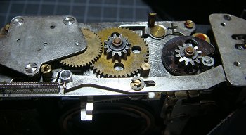 ![]() 今回の不具合は、ゼンマイを巻いてレリーズすると、シャッターが開かず、かつ、連続して巻きあがって しまう連写状態になってしまうというものです。これは、カメラ底部です。これらのギアとカムで、 シャッターチャージと巻き上げを行っています。ここは問題なさそうです。 |