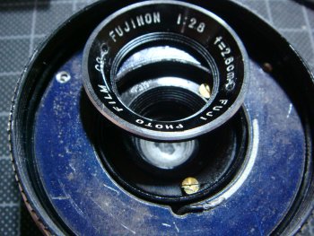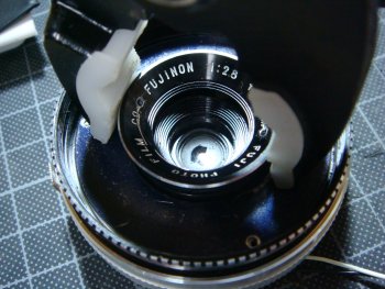![]() 4機種あるフジカのラピッドカメラのひとつ、ゼンマイカメラのD1です。 底部にあるゼンマイのカバーを取ったことろです。この中にゼンマイが巻かれて います。異常なしです。 |
