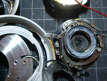 ![]() 続いて鏡胴の分解です。このカメラは、レンズを覆っている銘板が硬くて外れないので有名?です。 カニ目があるのですが、かなり大きな力を加えてもまったく回りません。接着してあるようですので、 隙間にシンナーを少し注し、ソフトプライヤーで直径方向に少し力を加えてから回転させて、 やっとのことで外れました。 |