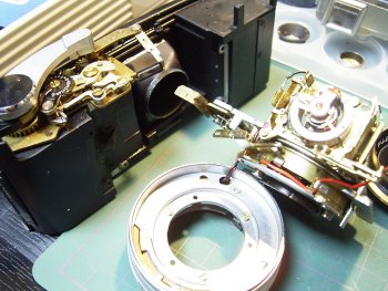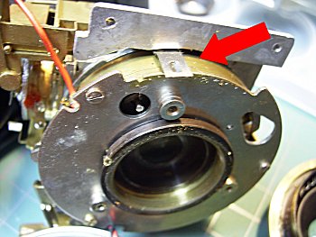 ![]() シャッターはベンジンで正常になりましたが、絞り羽根が動きません。 羽根をベンジンで洗浄しても改善しませんので、 鏡胴を分解することにしました。すると、赤矢印の絞りカムが曲がって いることが判明、強い力で曲げられたのでしょう。 |