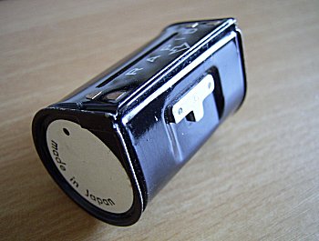 ![]() ラピッドフィルムのカートリッジです。35mmフィルムを詰め込めば使用することが できます。カメラに装填すると、中央にある銀色のT字金具が、 露出計に連動するカムを押し込み、露出計コイルの 角度を変えます。つまりこれがフィルム感度設定となります。 |