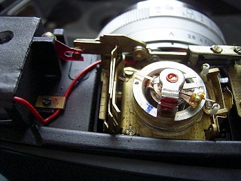 ![]() セレンには電圧が出ているのに、露出計が動きません。レンズボードを 外し露出計裏面を見ると、そこのリード線が断線していました。結線することで 改善しました。 |