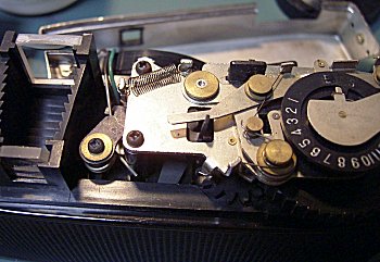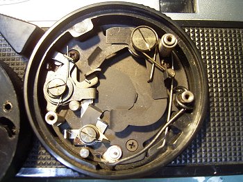 原因は軍艦部でした。裏蓋を開けるとフィルムカウンタがリセットされ、 蓋を閉め、かつフィルムを巻き上げ、カウンタが16になったとき、シャッターが 切れる状態になる仕組みでした。簡易な構造なのですが、この機構に気が付くまで時間を要しました。 なぜなら、一度分解された形跡がありカムの位置がずれていたからです。何とか調整して動作するようになりました。