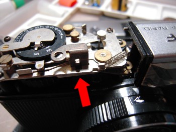 ![]() フジカのラピッドカメラの中でも珍しい機種であるSFの内部です。 レリーズボタンが押せなかったのは、赤矢印金具の角度がほんの少し 傾いていたからでした。すぐに改善しました。 |