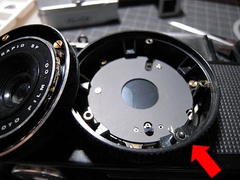 ![]() 鏡胴にお天気マークで切り替えられるシャッター速度リングが あるのですが、これが堅くて回転しません。分解してみると、 赤矢印のベアリング球の部分が固着していました。新しいグリスを 少し塗って改善しました。これでクリック感も出ました。 シャッターは簡易ながら、初代ラピッドSに比較して 内部は精密化しています。 |