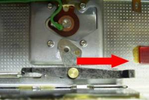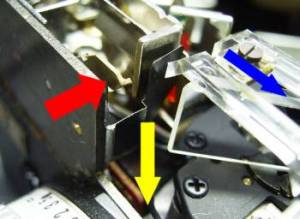 ファインダー付近の様子です。 上写真のスライドしたカムが赤矢印金具を押します。 この状態で、レリーズボタンを押すと、黒プレートが レリーズと共に黄色矢印の方向に下がります。その結果 奥のランプの光が透明プラスチック中を通ってファイン ダー内に通り、ストロボマークが見える仕組みです。