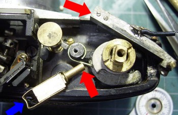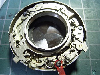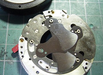 アームを組み入れ、弱ったスプリングを新し いものに交換しました。このアームは、巻き 上げレバーに連動して、左に平行移動し、シ ャッターをチャージさせる役目をしています。 これで直ったはずですが、シャッターがチャ ージされません。悪戦苦闘して、原因判明。 前述のへこみのせいで、内部空間が狭くな り、シャッターチャージレバーのスムースな 動きを妨げていました。へこみを直したら、 すぐに正常動作するようになりました。
