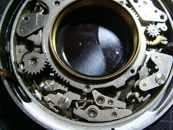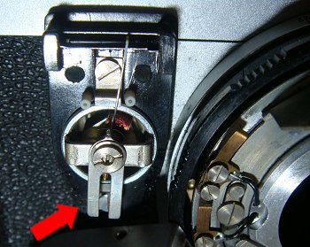 ![]() 軍艦部のセレン光電池によって動作する内蔵露出計の内部です。 フィルム感度設定は、鏡胴のリングで行います。露出計内部には 抵抗器などはなく、大変シンプルなものです。矢印は、指針の0点調整 レバーですが、外部からは触れない仕組みになっています。 |