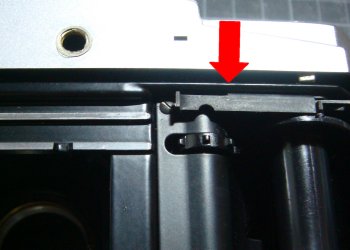 ![]() このカメラには、フルサイズとハーフサイズ撮影の2つもモードを持ってます。 ここに、シングルフレーム用マスクをはめ込むことで矢印のレバーが押され、 ハーフサイズモードになります。 |