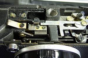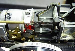これだけで、露出計指針(写真左)が動き出しました。 ファインダーもハーフカメラにしては凝った作りです。 赤プレートは、露出不足警告用です。