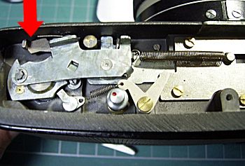 巻き上げ不動の原因はこのカムが下がったまま になっていることでした。どうして上がらないのか 動きをよく観察したら、右側にみえる長いスプリ ングのかける場所が違っていました。写真が正 常な状態です。誰かが、間違えたのでしょう。
