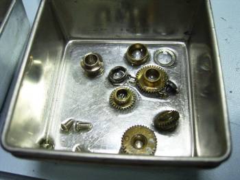 巻き上げノブが動かないのは、内部 ギアの固着でした。グリスが接着剤 のようになっているギア群を外します。