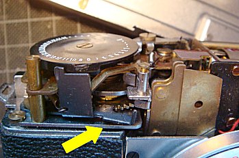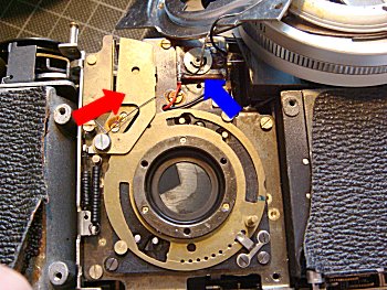 青矢印が露出計、赤矢印が露出計指針を挟み込む、ノコ歯です。