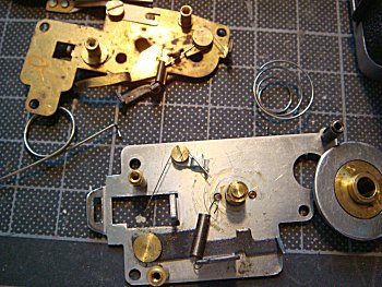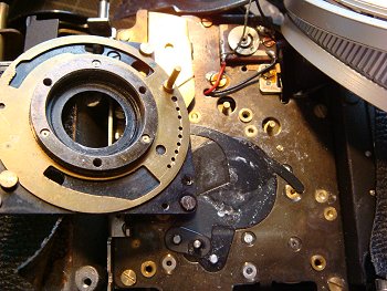 巻き上げもレリーズも動かない原因は、この金属部品の変形でした。多分、誰かが無理に巻き上げたのでしょう。