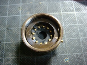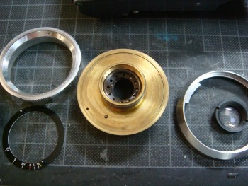 絞り羽根はシャッターより手前、真鍮色の円盤に付いています。