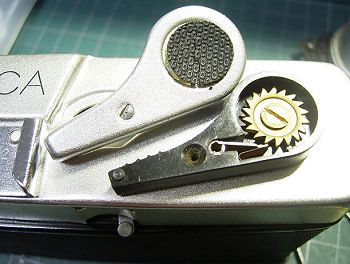 レリーズボタンが押せません。 構造を見てみると、フィルム室のスプロケットを 巻き上げ側に押えないとレリーズが押せない仕 組みでした。つまりフィルムを入れないとシャッ ターが切れない動作しない構造になっています。