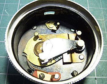 シンプルなロータリーシャッターです。 ベンジンで、動きは正常になりました。 バルブとインスタントの切り替えスイッチの 窓が見えます。(写真上部)部品欠損です。