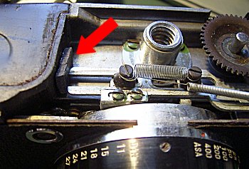|  巻き上げノブを回して巻き上げた時に、カーン!という金属音が します。動作には問題ないのですが、気になって原因を探ってみると。 赤矢印の部分に金属カムが衝突する音でした。よく見ると、ここに 劣化したモルトのような痕跡がありました。これがショックアブソーバに なっていたのです。ゴム片を貼ることで音はしなくなりました。 |