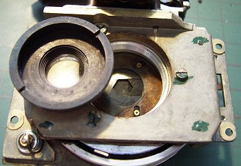 |  後群レンズを外すためには、レンズボードを外さなくてはなりません。 これで後群レンズはきれいになりました。残念ながら前玉に拭き傷が あり、写真は少しソフトな写りになっています。 |