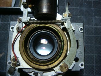 ![]() この露出計はレンズボードと一体になっていますので、ボディーから分離するときは、連動部の かみ合わせに注意が必要です。分離する時も、組み入れる時も、カムを写真のように押さえた状態 で行うと確実です。 |