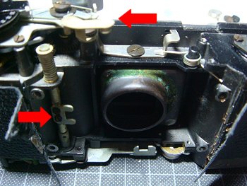 ![]() レンズボードを外した状態のボディーです。上の矢印は先程の露出計カム。下の矢印は レリーズボタン軸です。レンズボードを組み入れるとき、少し斜めにしてコの字型部分を 差し込むようにして組み込みます。 |